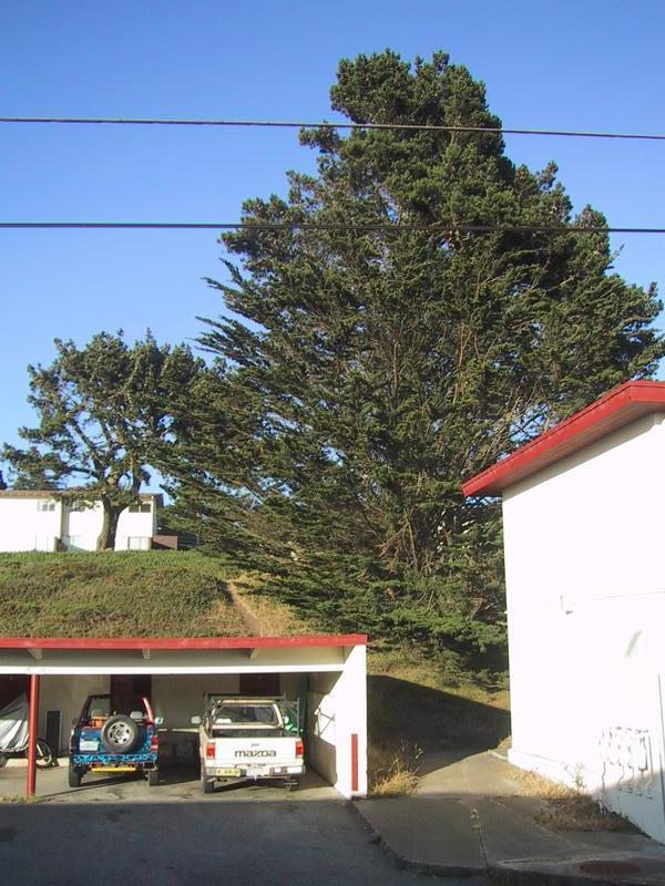 Towards the other apartments. Lots of succulent ground cover, power lines. Cars. | |